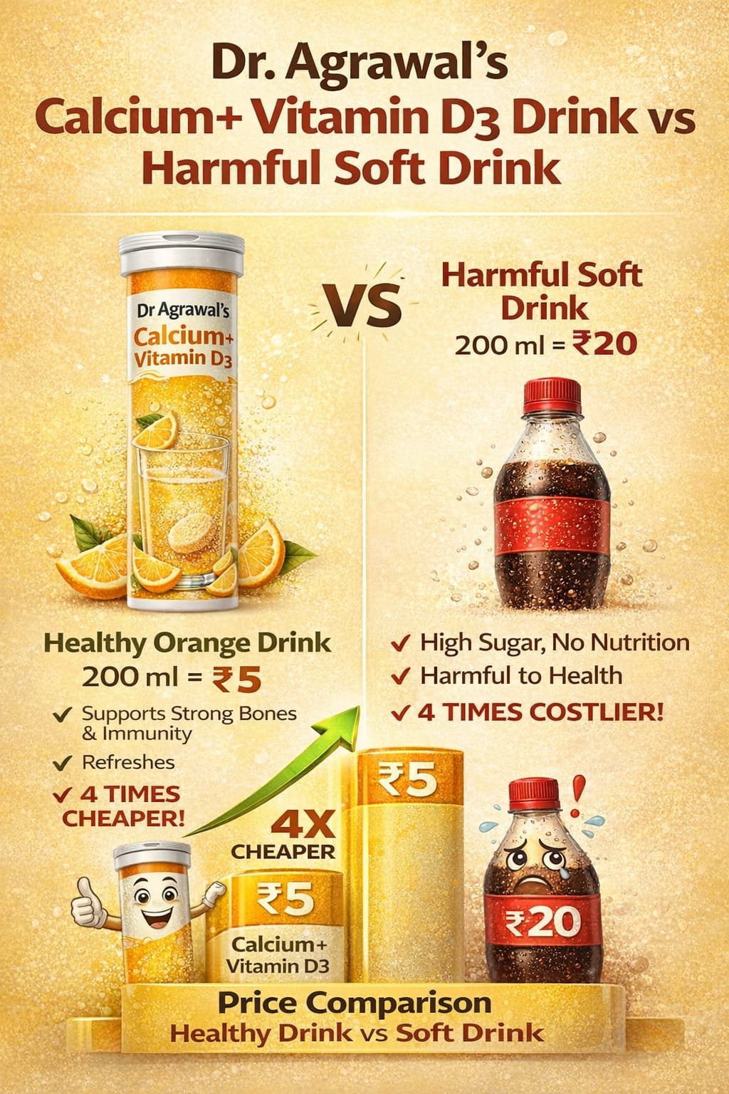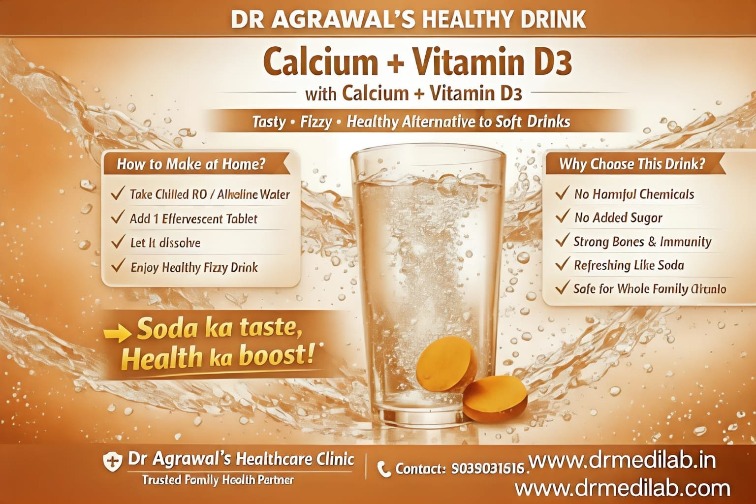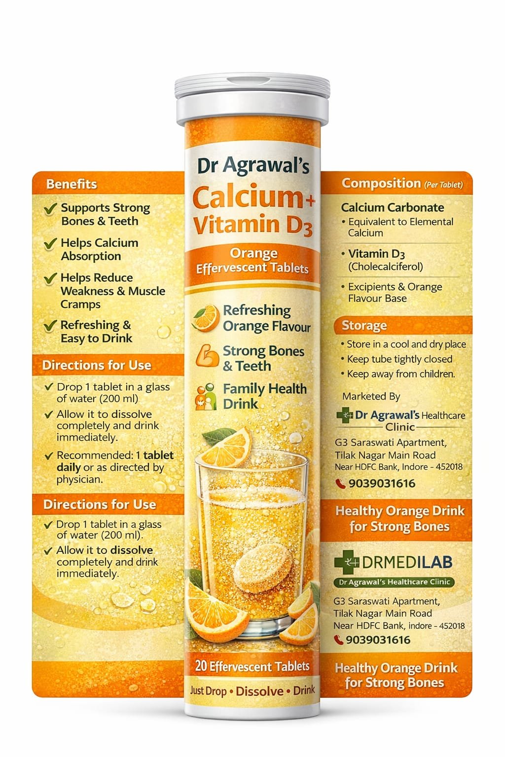 Boost your bone health with Dr Agrawal’s Calcium + Vitamin D3 Effervescent Tablets, specially designed to support strong bones, teeth, and overall wellness. This fast-dissolving formula ensures better absorption and quick action in the body.